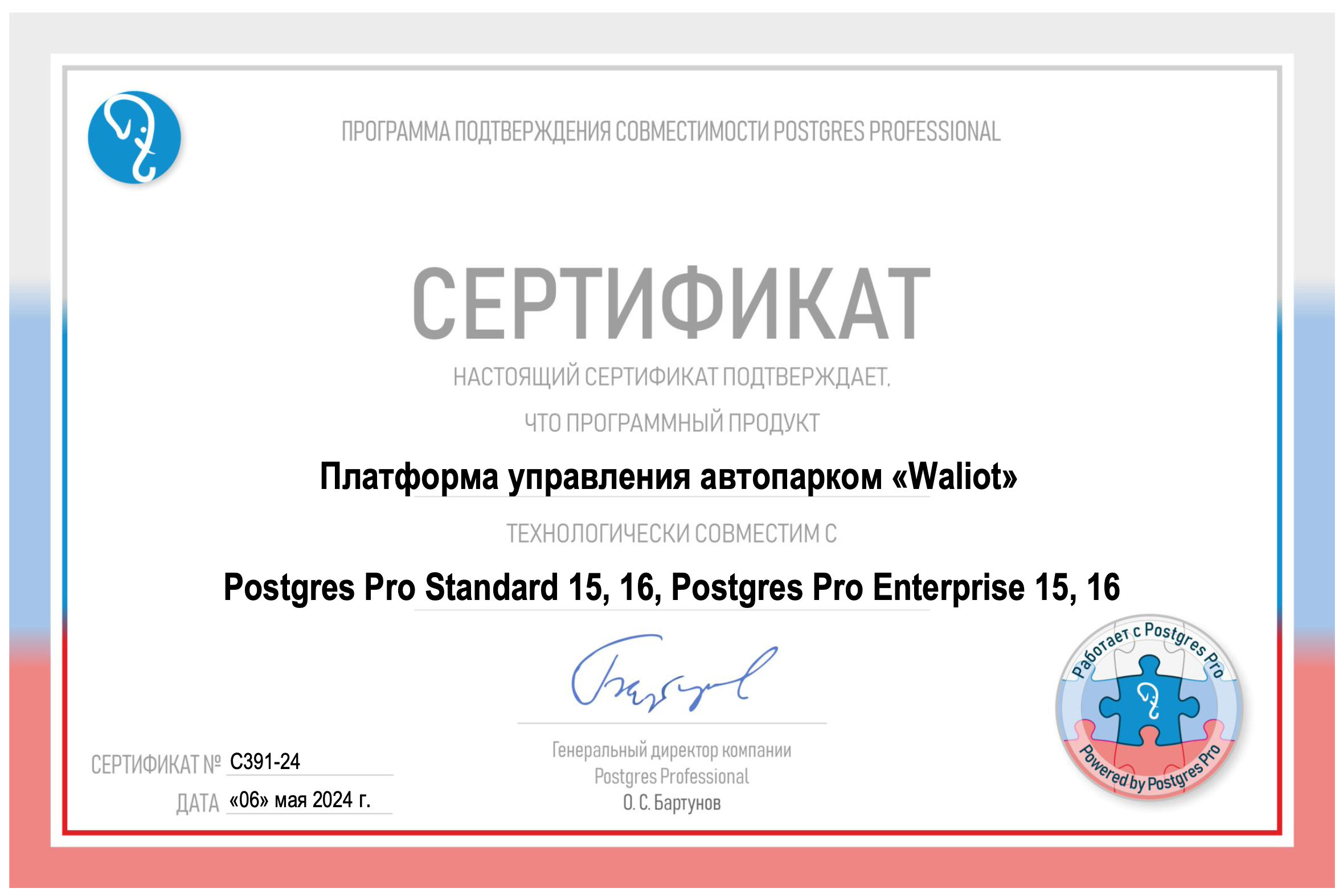 Подтверждает официальную совместимость платформы управления автопарком Waliot с отечественными СУБД Postgres Pro Standard и Postgres Pro Enterprise. Документ выдан в рамках сертификации программного обеспечения для обеспечения отказоустойчивости, стабильности и соответствия требованиям российских IT-инфраструктур.
