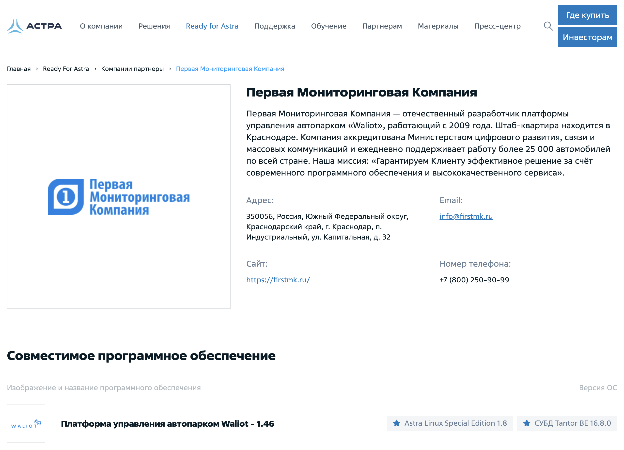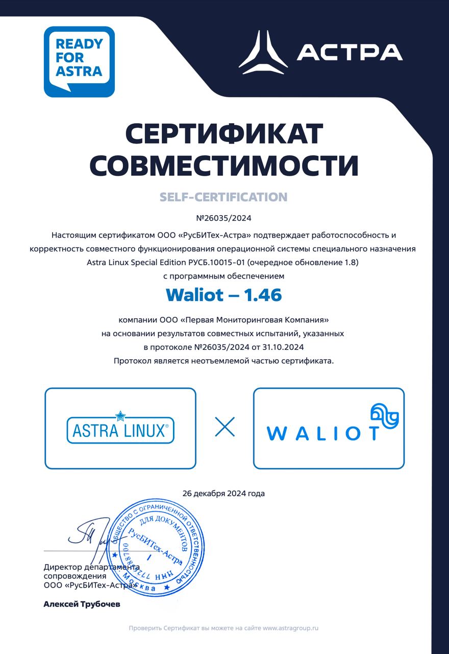 Сертификат подтверждает успешное прохождение совместных испытаний и полную совместимость платформы Waliot с защищённой операционной системой Astra Linux Special Edition. Это обеспечивает соответствие требованиям по информационной безопасности и позволяет использовать Waliot в организациях с критической ИТ-инфраструктурой, в том числе в рамках импортозамещения.