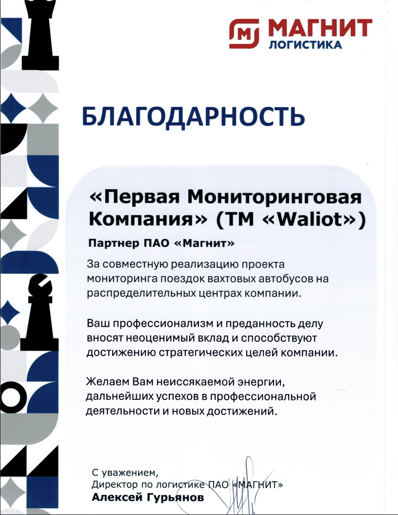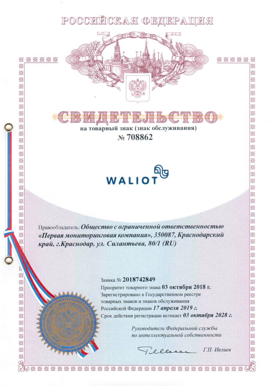 Свидетельство подтверждает регистрацию товарного знака WALIOT в государственном реестре Российской Федерации. Регистрация обеспечивает правовую защиту бренда и исключительное право использования знака на территории РФ. Товарный знак защищает как логотип, так и наименование системы Waliot — ключевого продукта компании ПМК в сфере транспортной телематики.