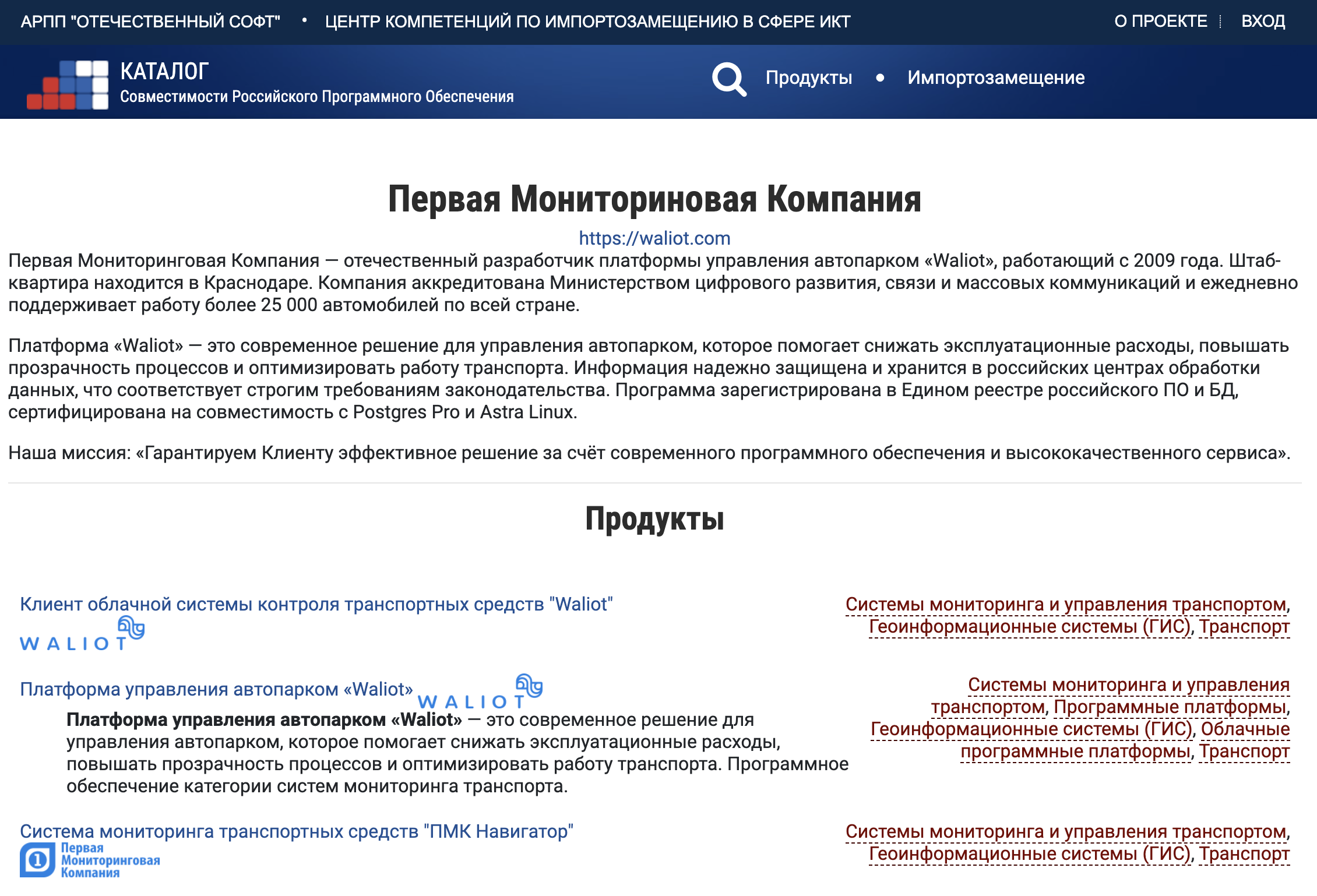 Платформа Waliot включена в каталог АРПП "Отечественный Софт" как решение, соответствующее требованиям законодательства и совместимое с российскими ИТ-инфраструктурами. Каталог подтверждает официальное признание Waliot как совместимого решения для цифровизации транспорта в рамках стратегии технологического суверенитета РФ.