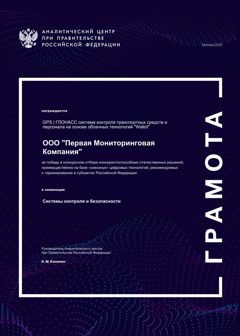 ПМК награждена за победу в конкурсном отборе конкурентоспособных отечественных решений на базе сквозных цифровых технологий. Решение Waliot признано одним из лучших решений в сфере контроля и безопасности, рекомендованным к тиражированию в субъектах Российской Федерации.
