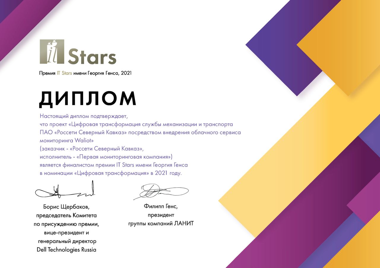 Проект Waliot был признан одним из лучших цифровых решений 2021 года и вышел в финал престижной отраслевой премии IT Stars имени Георгия Генса в номинации «Цифровая трансформация». Это признание подчёркивает вклад ПМК в цифровизацию инфраструктурных отраслей России.