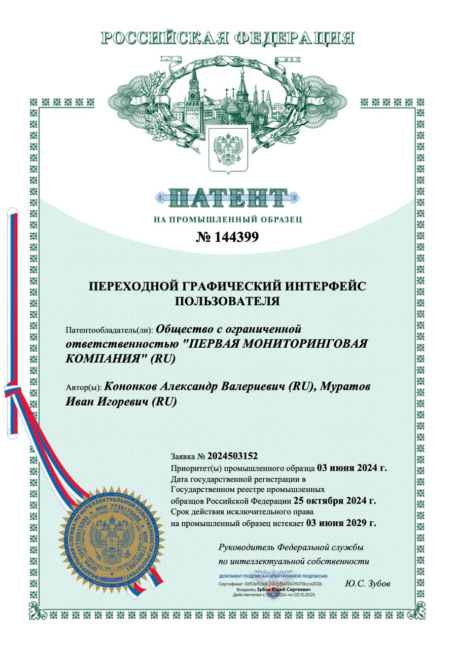 Патент удостоверяет исключительное право на промышленный образец «переходного графического интерфейса пользователя», применяемого в системе Waliot. Интерфейс защищен как элемент дизайна и архитектуры пользовательского взаимодействия в программном обеспечении для мониторинга транспорта.