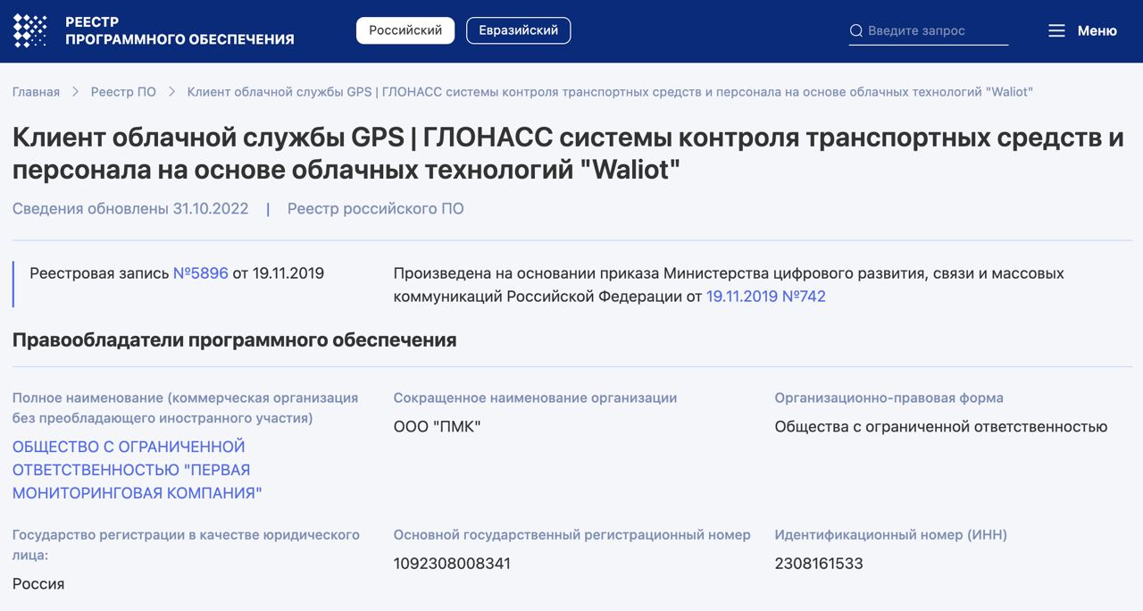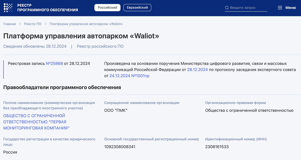 Программное обеспечение Waliot официально зарегистрировано в Едином реестре российского ПО. Это подтверждает его российское происхождение, отсутствие иностранного владения и соответствие требованиям, предъявляемым к ИТ-продуктам для государственных и инфраструктурных проектов.