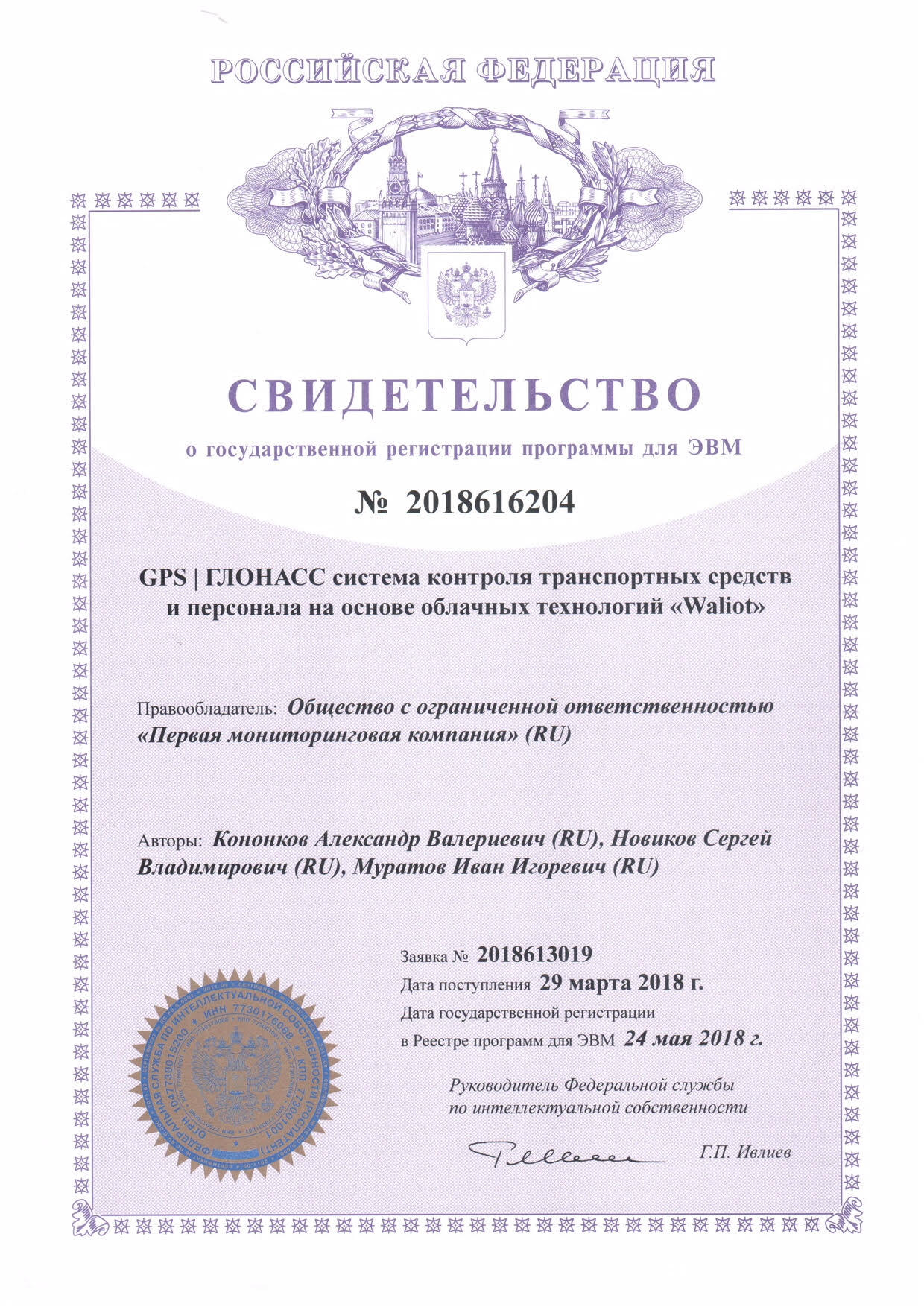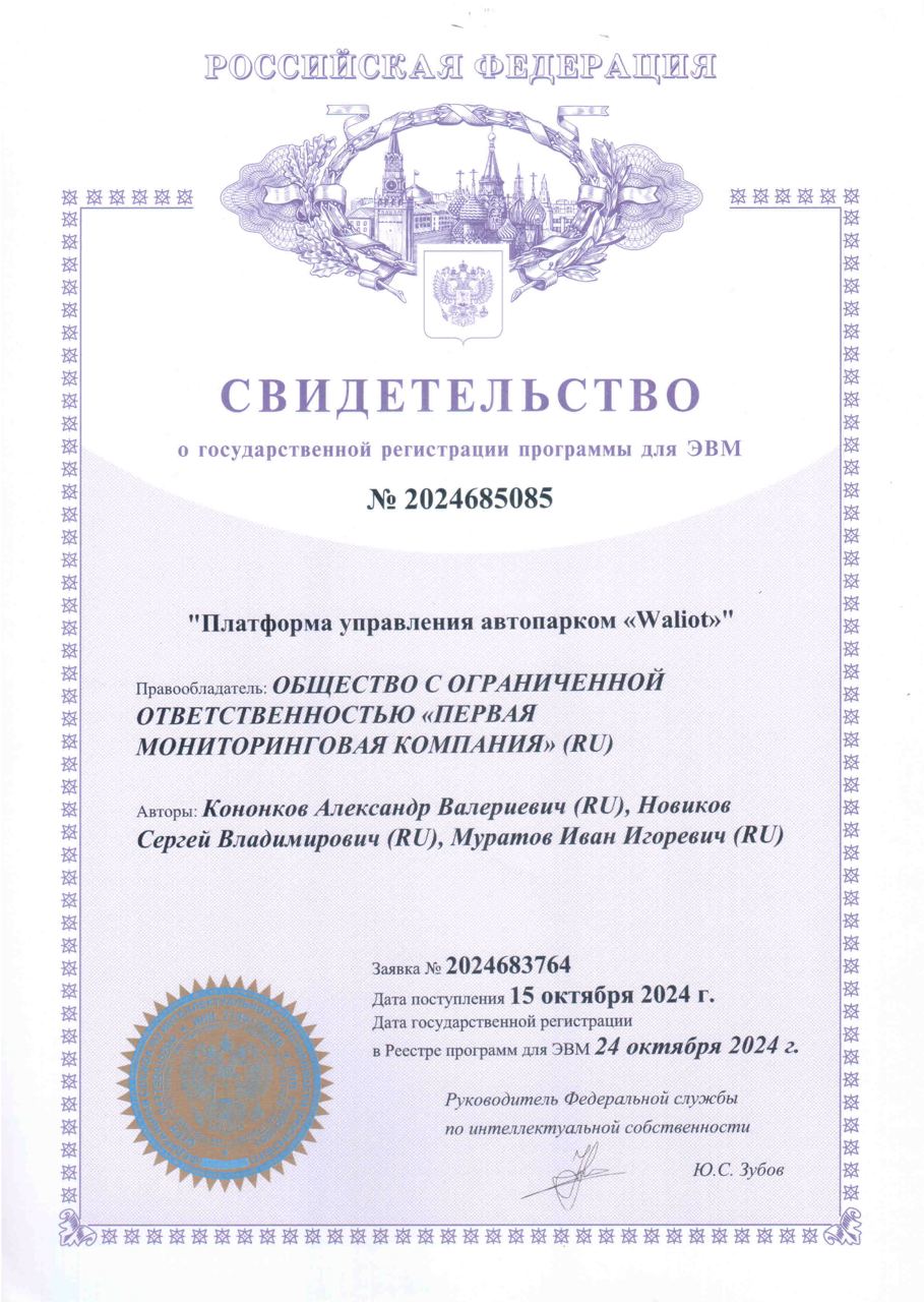 Свидетельство подтверждает, что программное обеспечение Waliot зарегистрировано в качестве официальной интеллектуальной собственности. Этот документ юридически защищает архитектуру и логику работы платформы, которая является облачным решением для мониторинга транспорта и персонала. Waliot — ключевой продукт ПМК, использующий современные технологии для управления автопарками и цифровизации транспортной логистики.