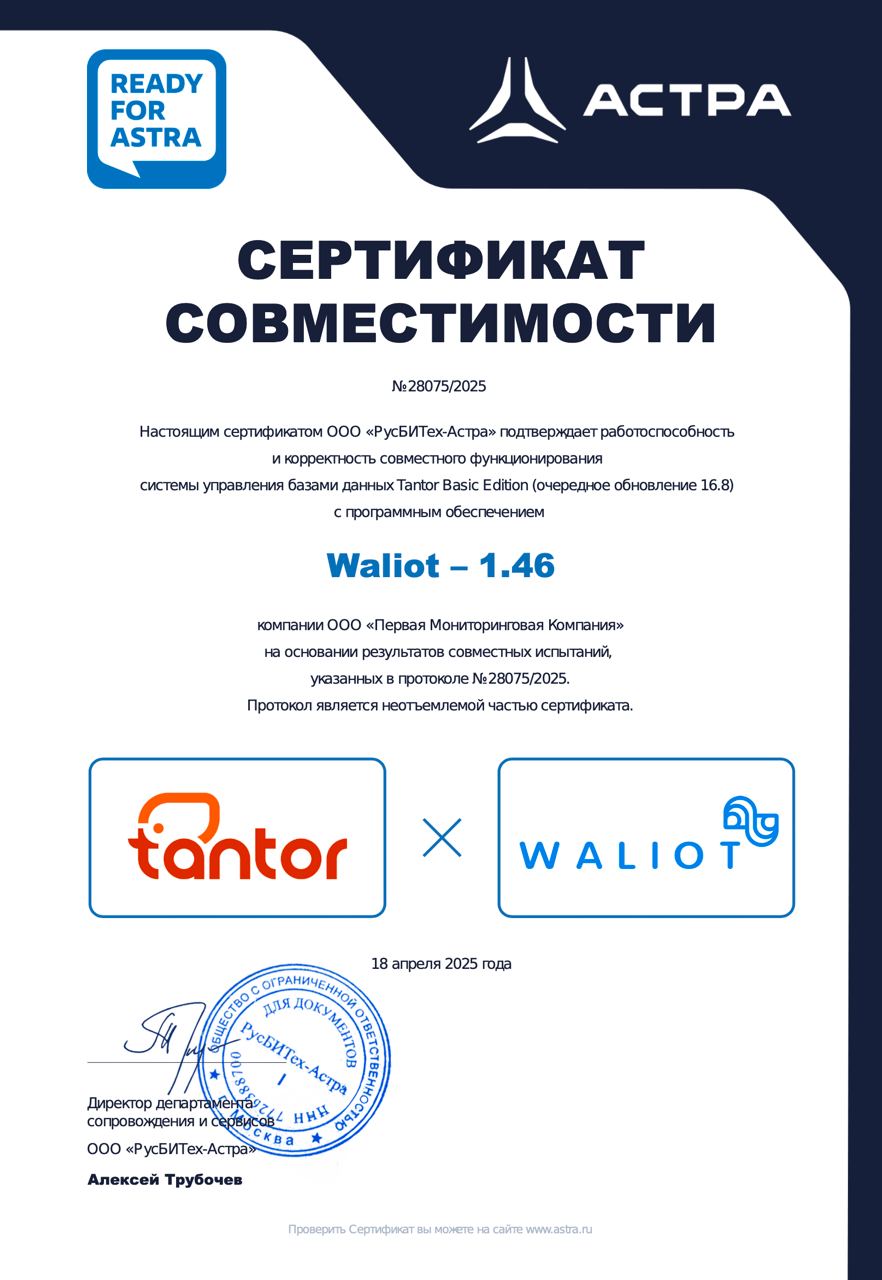 Сертификат подтверждает корректную совместную работу Waliot с системой управления базами данных Tantor Basic Edition. Выдан по результатам испытаний компанией «РусБИТех-Астра».