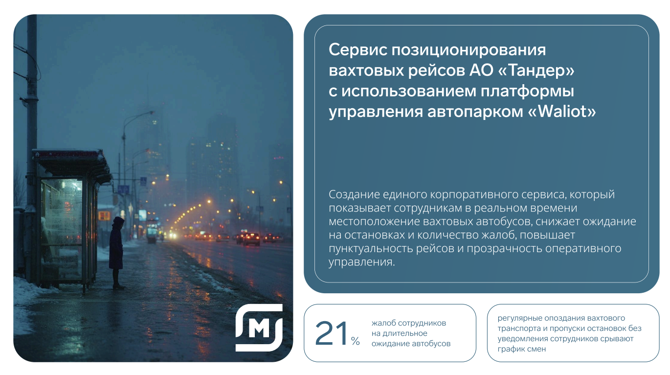 Создание единого корпоративного сервиса, который показывает сотрудникам в реальном времени местоположение и ETA (расчетное время прибытия) вахтовых автобусов, снижает ожидание на остановках и количество жалоб, повышает пунктуальность рейсов и прозрачность оперативного управления.