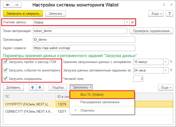 На стороне 1С необходимо указать каким ТС в базе соответствуют объекты из Waliot. Выполните синхронизацию: