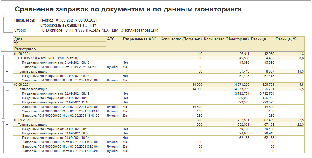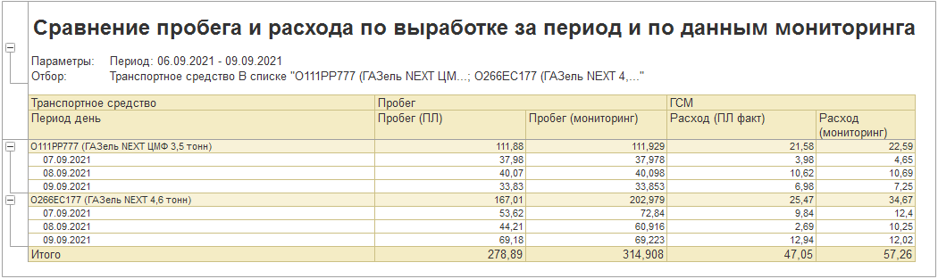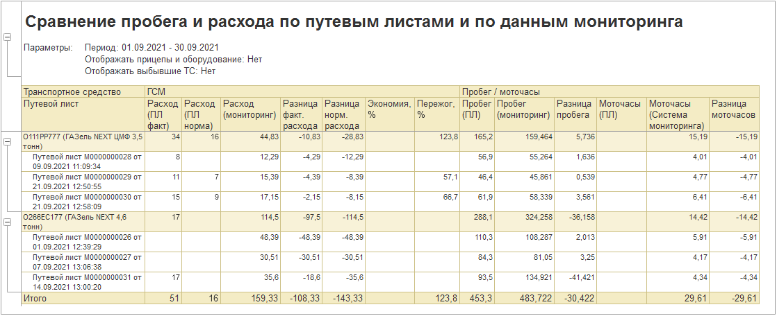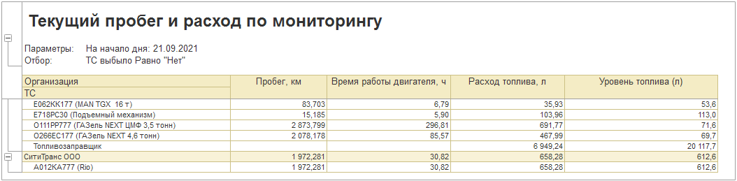 «Заполнить по мониторингу одометр и остаток топлива при возврате» — заполняет одометр возвращения и остаток топлива в баке ТС на момент возвращения по данным мониторинга, а также пробег и моточасы ТС в шапке документа и табличную часть «ГСМ».