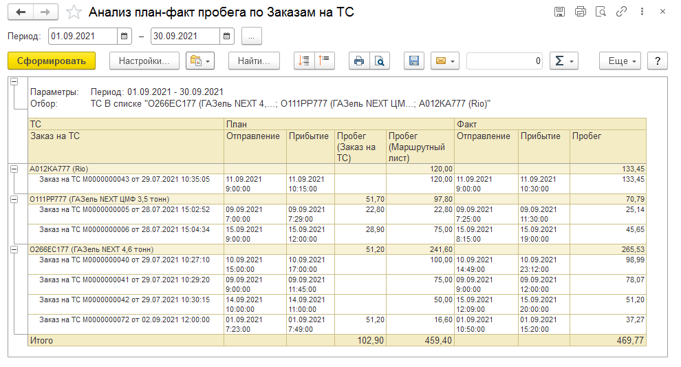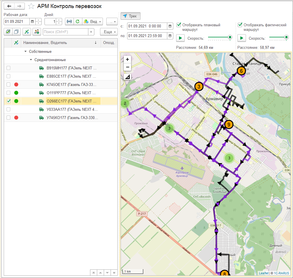В АРМ «Контроль перевозок» установите рабочую дату, выберите ТС — увидите текущие координаты и трек. Для сравнения с планом создайте «Маршрутный»/«Путевой лист»: план — фиолетовый, факт — черный.