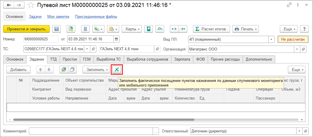 В «Путевом листе» (вкладка «Задание») нажмите «Заполнить фактическое посещение пунктов…». Алгоритм возьмет координаты из регистра «Координаты по мониторингу» и заполнит фактические прибытия/убытия (учитывается радиус точки и ограничение скорости ≤ 5 км/ч). Аналогично работает для «Маршрутного листа» и в АРМ «Контроль перевозок».