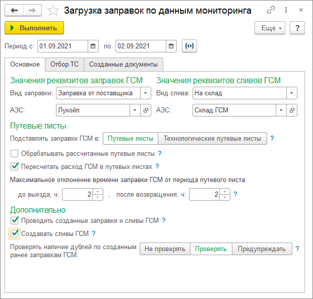 Откройте Мониторинг → Загрузка заправок по данным мониторинга (или «ГСМ → Заправки ГСМ → Загрузить → …из мониторинга»), задайте период, тип заправки и АЗС, выберите подстановку в «ПЛ»/«ТПЛ», при необходимости включите перерасчет расхода и опцию «Создавать сливы ГСМ». Выполните загрузку — документы «Заправка ГСМ»/«Слив ГСМ» будут созданы автоматически.