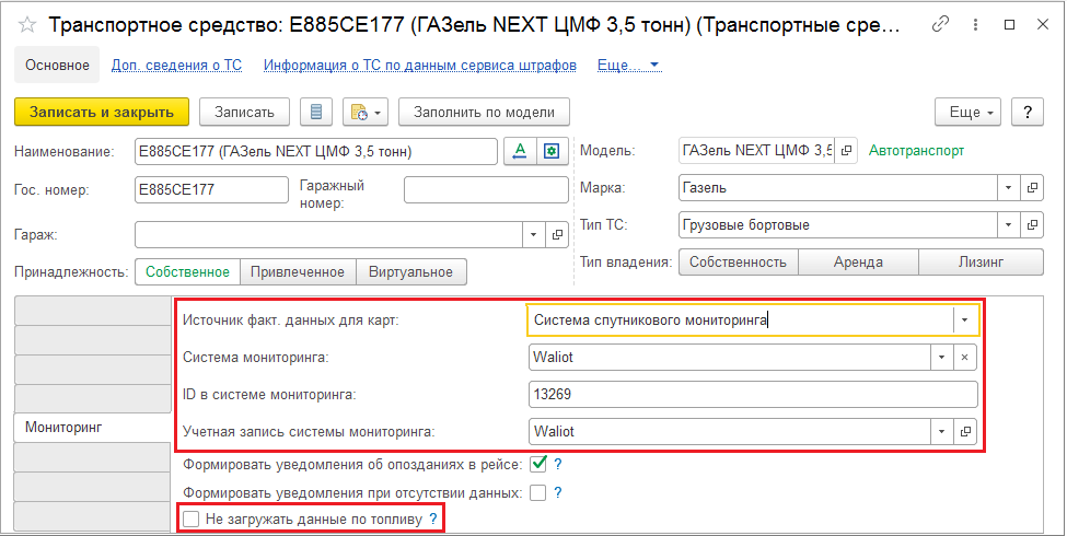 Идентификаторы ТС из Waliot сохраняются в справочнике «Транспортные средства и оборудование». В случае необходимости их можно изменить вручную на вкладке «Мониторинг».